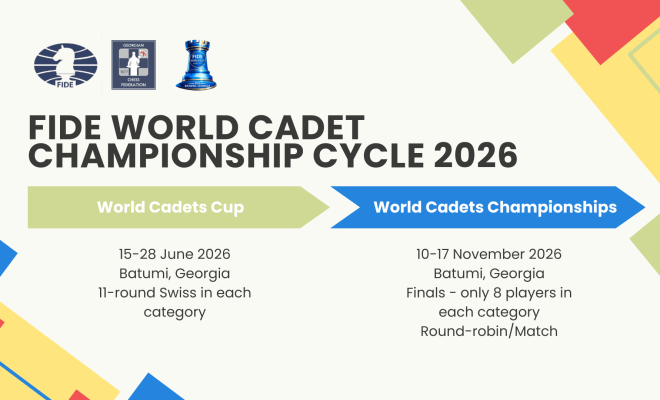 The inaugural edition of the FIDE World Cadets Cup under this new structure will take place from June 15-28, 2026 in Batumi, Georgia, and will follow the same proven system used in recent editions of the World Cadet Championships, with separate tournaments for boys and girls in the U8, U10, and U12 categories.